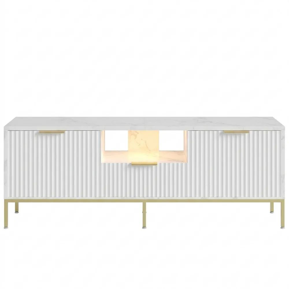 Moderner TV-Ständer mit geriffelter Front aus Dekorlaminat. Er hat Türen, die geöffnet oder geschlossen werden können, um Geräte zu präsentieren oder zu verstauen. Der TV-Ständer eignet sich für Fernseher bis 60 Zoll und bietet eine Schublade sowie zwei Schränke für Stauraum. CDs, Spielkonsolen, Plattenspieler und Bücher können übersichtlich organisiert werden. Integrierte LED-Leuchten bieten verschiedene Farben und Modi zur Beleuchtung. Hergestellt aus MDF-Platten der Klasse P2 mit wasserfester Beschichtung, was die Reinigung erleichtert. Acht goldene Beine mit Nivellierfüßen sorgen für Stabilität.